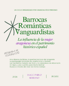 - ¿Cuándo? – 30 de enero a las 19:30h: Ana Abarca de Bolea, la poetisa barroca del aragonés. Fechas por confirmar: La pedagogía feminista de Josefa Amar y Borbón – Las hermanas Catalán de Ocón y la naturaleza de Albarracín- Un lápiz y una cuartilla para María Moliner – Huesca a través del visor de Divina Campo.